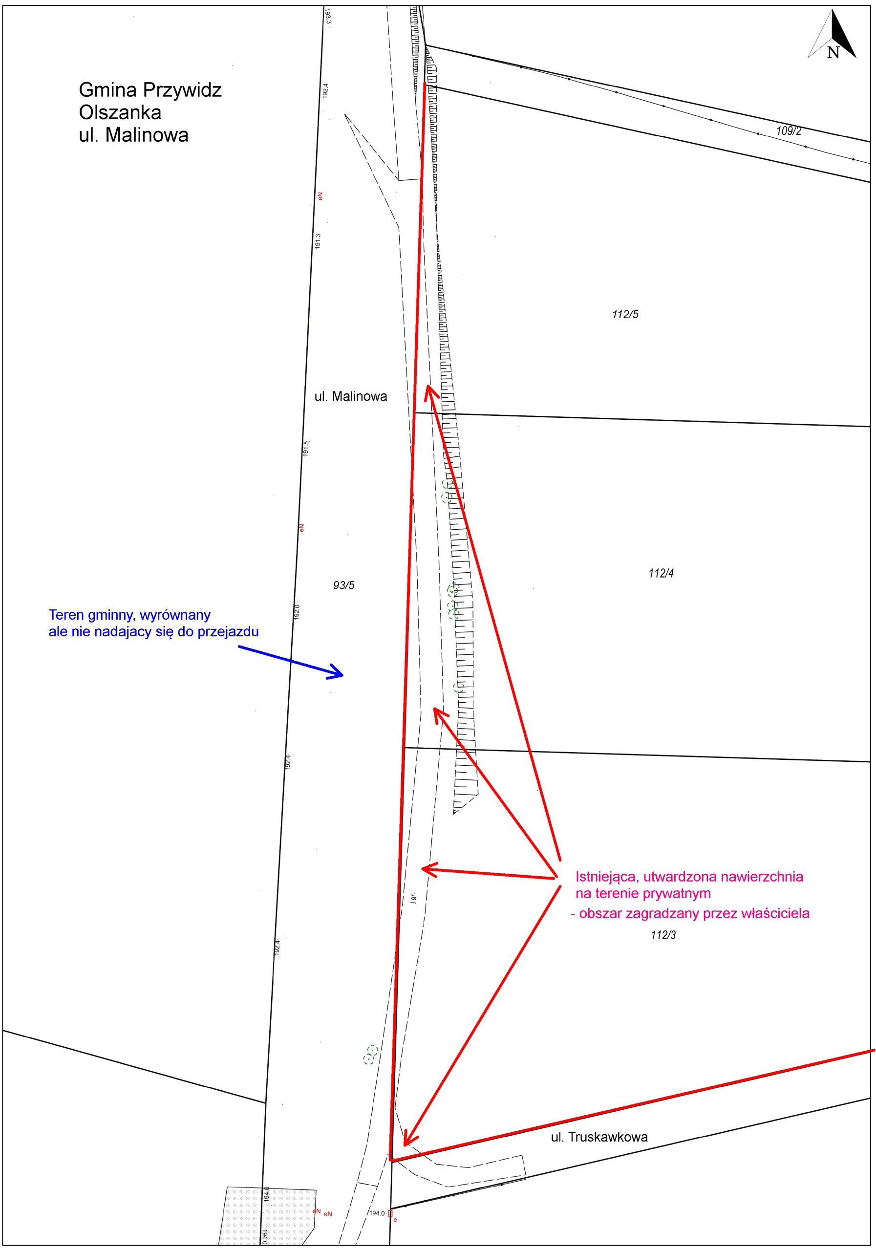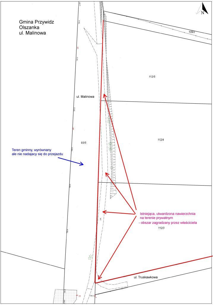 Problem ten związany jest z faktem ustalenia granic ewidencyjnych działek przylegających do drogi, w wyniku czego okazało się, że teren z utwardzoną nawierzchnią, po którym od lat jeździliśmy, stanowi faktycznie działkę prywatną natomiast droga gminna (ul. Malinowa) powinna znajdować się równolegle ale kilka metrów obok.